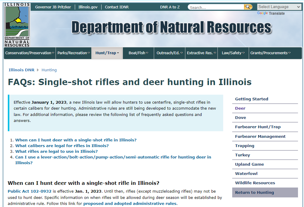 Effective January 1, 2023, a new Illinois law will allow hunters to use centerfire, single-shot rifles in certain calibers for deer hunting. Administrative rules are still being developed to accommodate the new law.